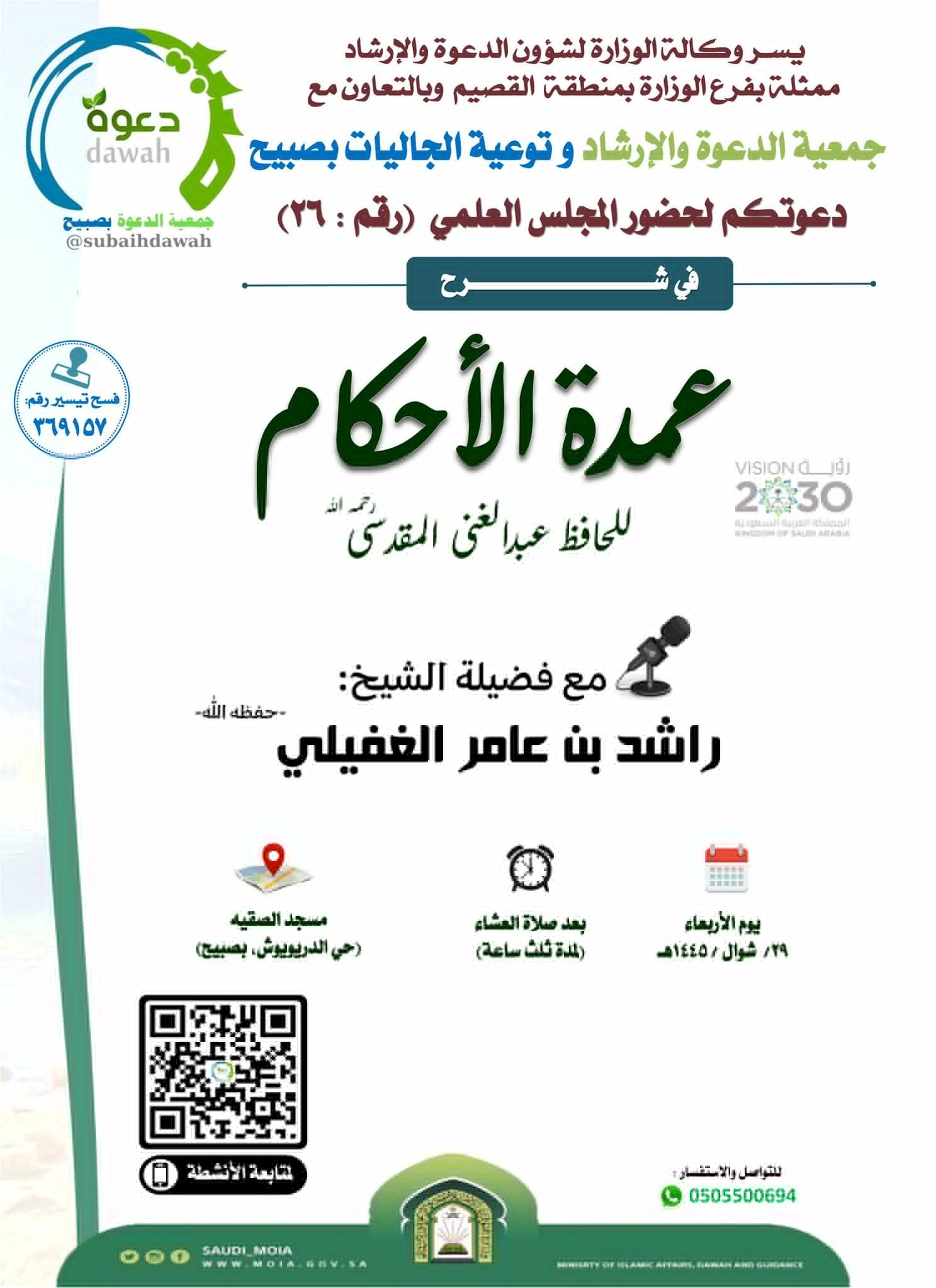 #دعوة_صبيح #صبيح يسرنا دعوتكم لحضور المجلس 26 في شرح عمدة الأحكام مع فضيلة الشيخ / راشد بن عامر الغفيلي حفظه الله